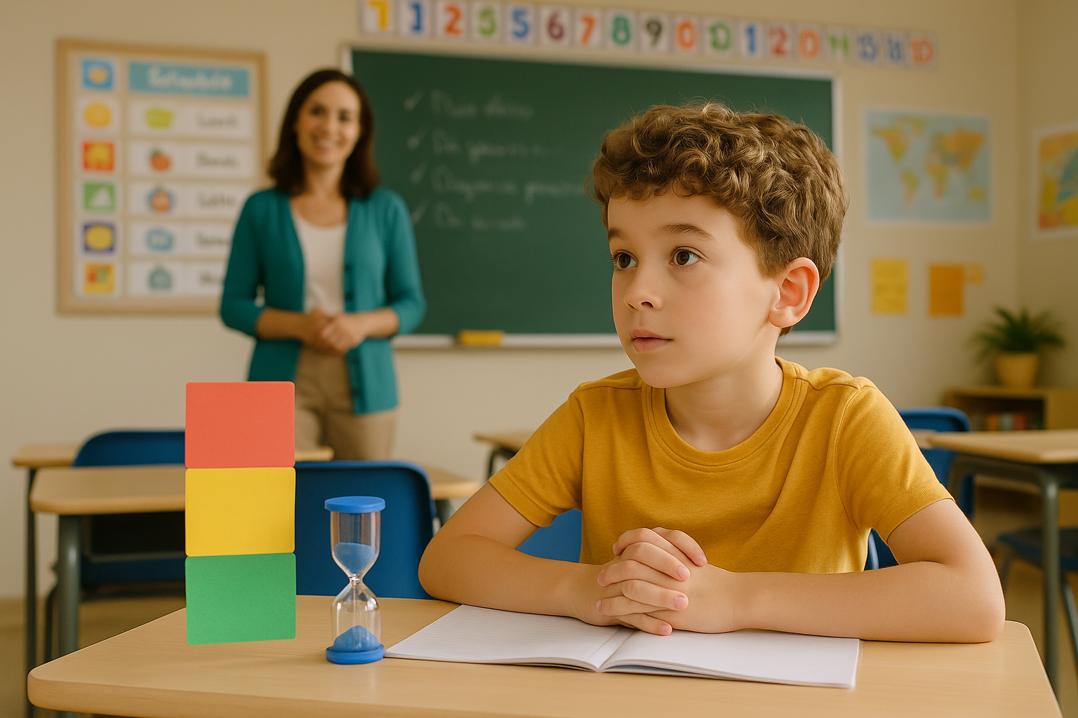 TDAH transforma a sala de aula num desafio: carteiras alinhadas, o quadro branco cheio de anotações, crianças levantando