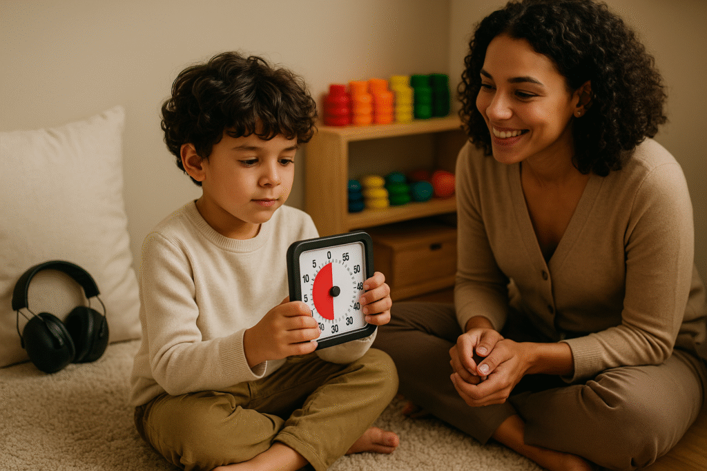 - Em casa: cantinho da calma, rotina previsível, timer visual e paciência extra.